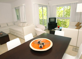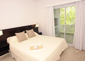 Las de hasta 4 personas (60 m2) tienen las mismas comodidades y equipamiento, salvo que tienen un solo dormitorio independiente, un solo baño completo y no tiene pool ni billar gol.