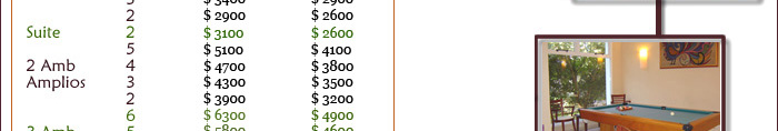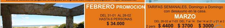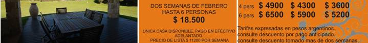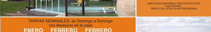 Disponibilidad a confirmar. Las reservas se efectuan con el 50% de la estadía por depósito o transferencia bancaria, o, personalmente. Los pagos se realizan en efectivo o con cheque diferido personal a 30 días.
